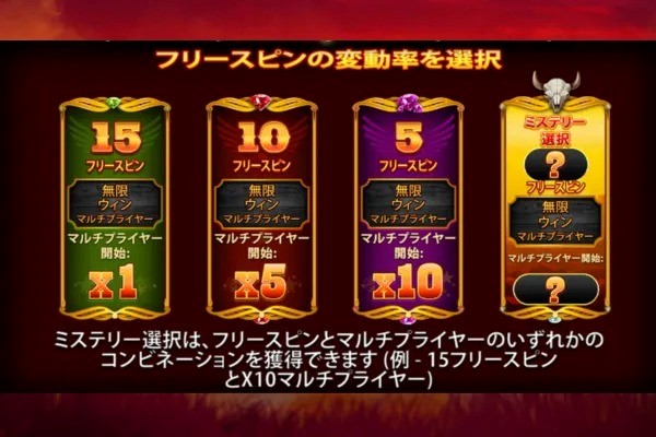 本作では、フリースピン開始前にプレイヤーが自由にフリースピンのモードを選べる設定になっています。